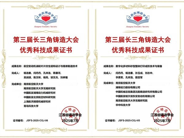 2025年7月12日,我院联合南京航空航天大学,中国航发湖南动力机械研究所、中国机械总院集团沈阳铸造研究所有限公司、中国航发北京航空材料研究院等企事业单位在第三届长三角铸造大会上发布的航空发动机涡轮叶片仿生结构设计与精准制造技术、数字化多材料砂型整体打印成形技术与装备两项科研成果获优秀科技成果奖。